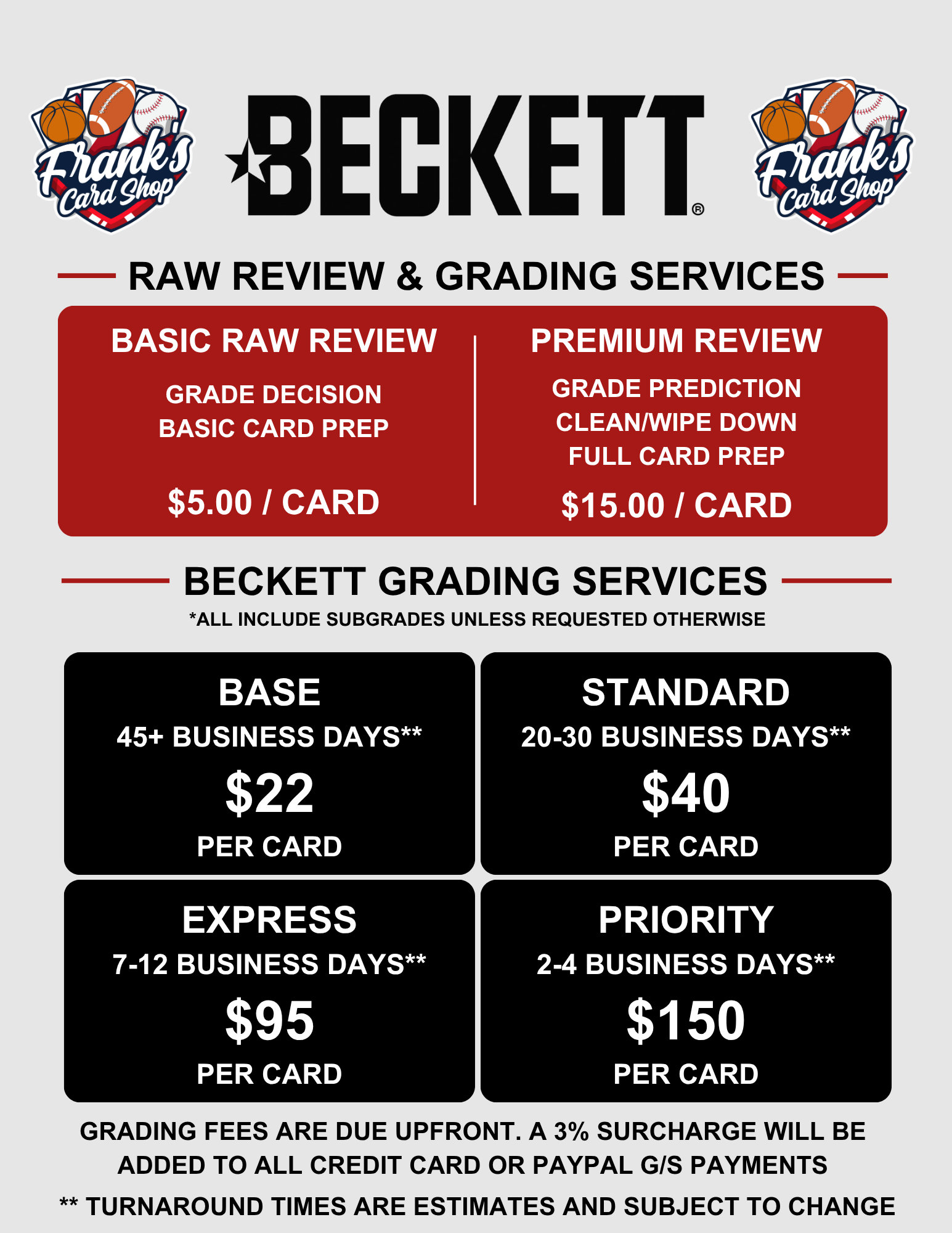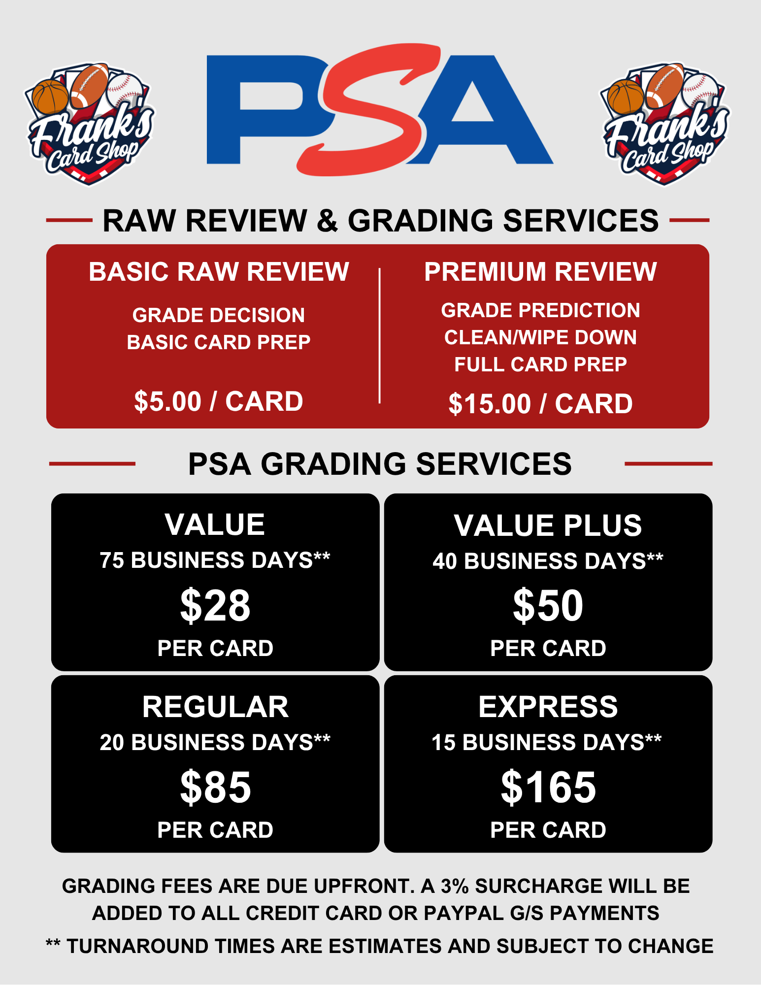 We offer weekly grading submissions to Beckett and PSA. We handle everything from beginning to end, ensuring your cards are cared for throughout the entire grading process. Each grading company offers a variety of service levels with varying prices and turnaround times. We will help guide you through choosing which company and service level to pick, as well as recommending which cards you should grade in general. Our expert staff has years of experience in the grading process and is ready to help you achieve as many Gem Mint ratings as possible!